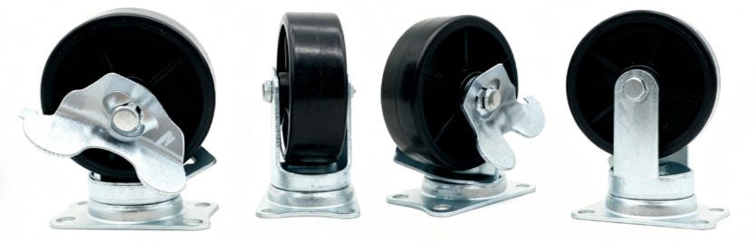 - Nylon: High strength and low rolling resistance—ideal for heavy loads, cold storage, and outdoor scenarios.